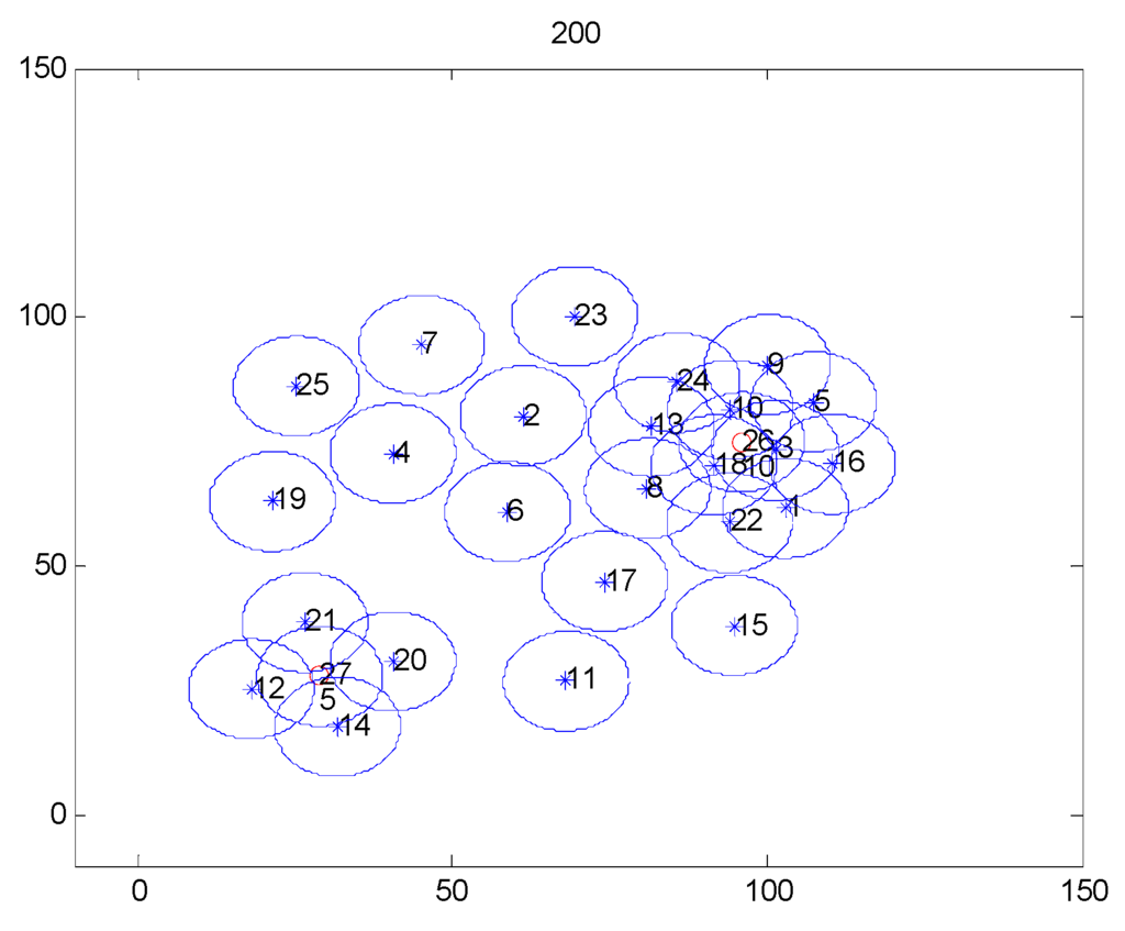 For some applications, such as rescue and search operations, it is preferred to deploy more robots in certain locations than others do. In this case, the location that should attract more robots, the setting of should be higher relative to other robots’ setting of , and proportional to the preference that needs to be given to that point. As seen in Figure 3, points 26 and 27 have different preferences, and the preferential of point 26 needs to be higher than that of point 27. As a result, point 26 was able to attract more robots to its vicinity. Higher attractive force is given to a point by multiplying its by a factor relative to the attraction of the others. For example, in Figure 3, point 26 and 27 require a demand of 10 and 5 robots, respectively. So, point 26 has multiplied by 10, while, point 27 has multiplied by 5.