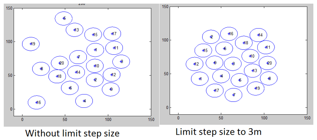 In all the above settings, the step size should be limited; otherwise, the robots will not stabilize at all. For example, if robots are very close to each other, the repulsive force will be high and could cause them to move a larger distance, which would result in robots getting out of range of each other. In other cases, it could trigger an oscillation cycle of high attractive force, then high repulsive force, and so on. Hence, the network deployment will not stabilize at all. This effect is shown in Figure 5, where the number of robots is 20. It is recommended that the step size should be set to be less than ; however, if its value is too small, it may slow down the convergence and trigger a high number of communication messages. Limiting step size also produces the required uniform distribution of robots and reasonable movements.