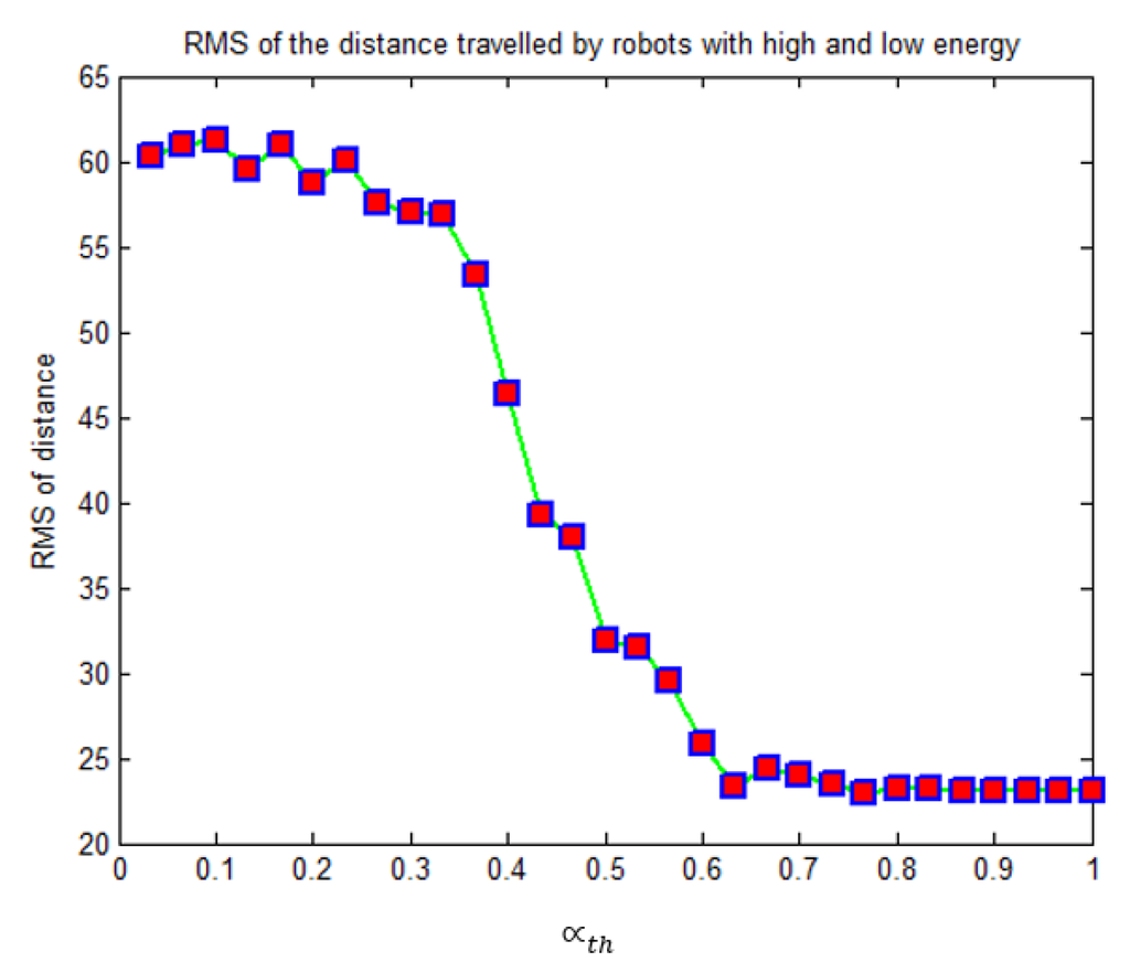 - The value of is selected based on conducting different experiments. We have tested a range of values from 0.03 to 1. For each value, the number of robots varies from 6 to 30, half of them with low energy and the second half with high energy. Then, we measure the sensitivity by computing the root mean square (RMS) of the difference between the average traveled distance by low-energy robots and high-energy robots. Figure 6 shows that increasing the level of the threshold gives a good result until it reaches around point 0.3, where the RMS starts to decline. This gives us an insight of how we can choose the threshold value to attain the best result.