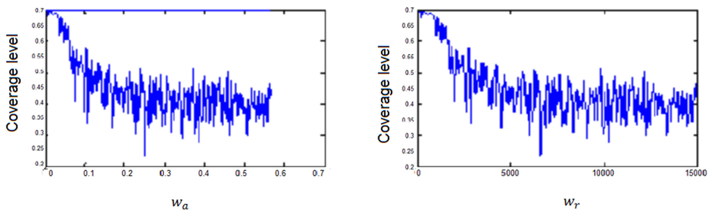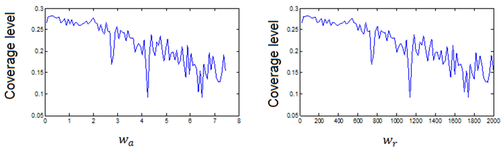 Coverage level achieved for different settings of and. The number of nodes = 50, Dth = 20, and area size = 150 × 150 m.
