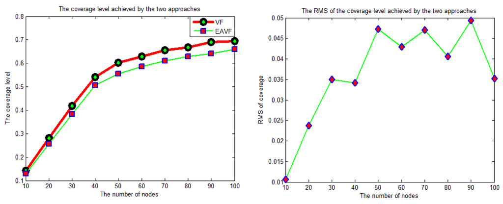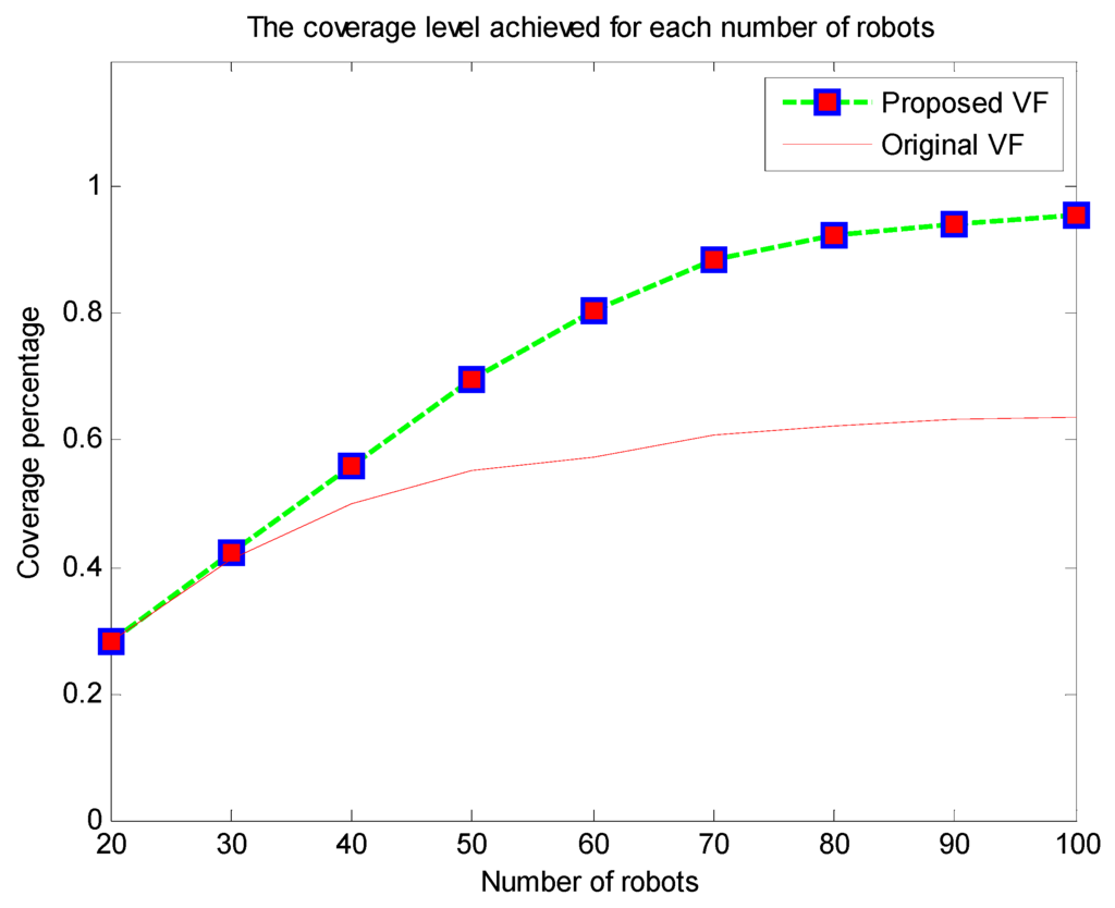 We have tested the above formulas of and on different scenarios with different requirements. Moreover, we have tested the virtual force approach with different settings of to study its relationship with a different number of robots. As we can see from the results in Figure 7 and Figure 8, for different numbers of robots, there is a safe region where the value of provides the highest performance in terms of coverage maximization. If we would like to make some robots preferential over others, the other robots should have the same value and the of the preferred robots should be set higher relative to how much preference we would like to set.