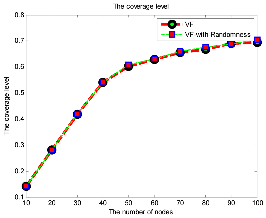 The coverage level achieved by the proposed approach with added randomness to the antenna communication range.