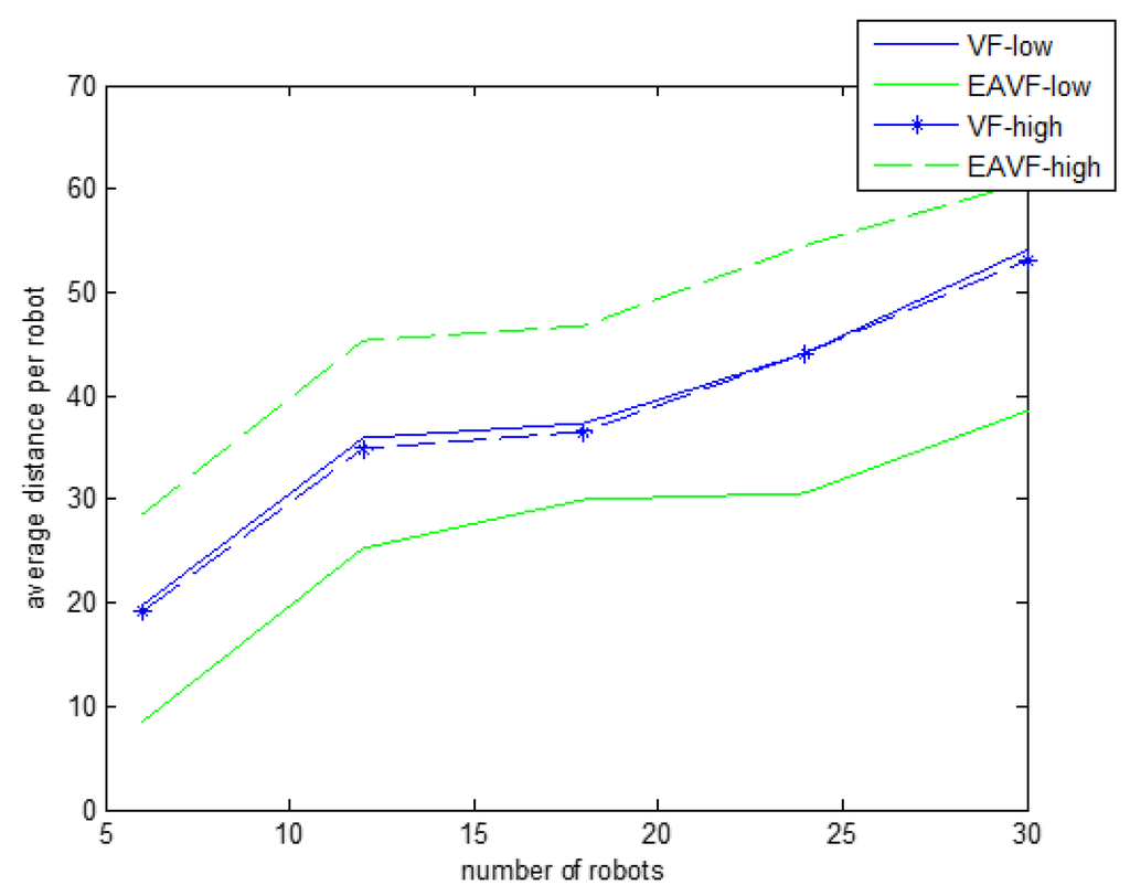In order to investigate the effect of robot remaining energy on the deployment process, we have conducted some experiments using the original virtual force and the energy-aware virtual force. We find that the proposed approach is able to balance the energy consumption among the robots with high remaining energy and those with a low level of remaining energy, as in Figure 11. In the original virtual force, all robots, regardless of their remaining energy, have traveled almost the same distance, while with the energy-aware approach, the robots with a low energy level (EAVF-low) have traveled less distance compared to those with a high energy level (EAVF-high).