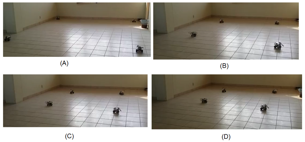 Attractive force test using four EV3 robots. (A) The initial position of the robots. (B) Robots after moving one step. (C) Robots after moving another step. (D) Final deployment.