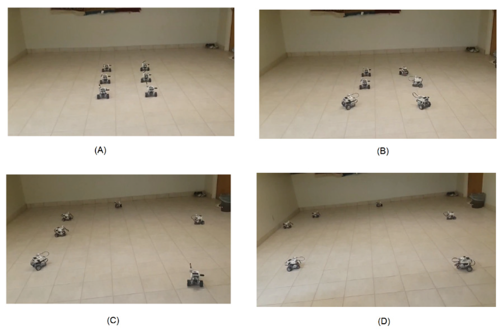 Repulsive force test using six EV3 robots. (A) The initial position of the robots. (B) Robots after moving one step. (C) Robots after moving another step. (D) Final deployment.