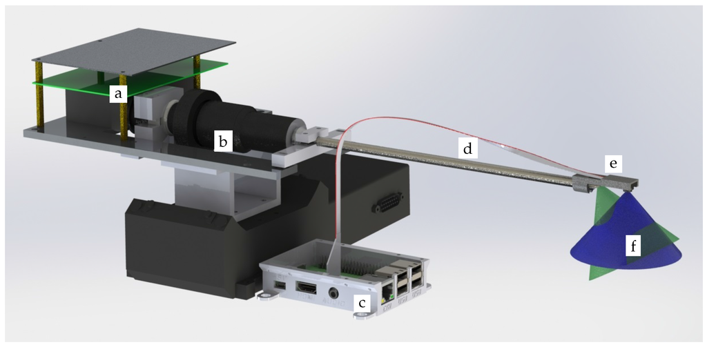 Rendering of the measurements system. The system is mounted on a goniometer. The following parts are labeled: (a) projector; (b) camera adapter; (c) Raspberry Pi 2; (d) borescope shaft; (e) camera (f) fields of view of the projector (green) and the camera (blue).