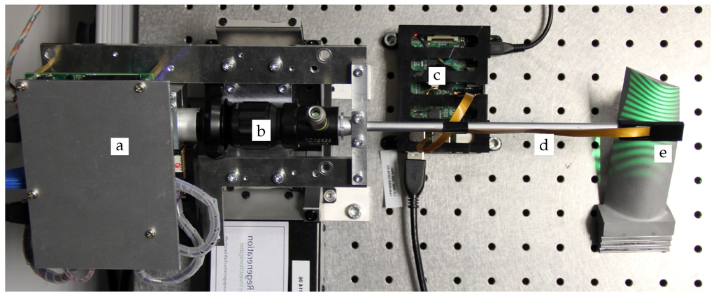 In order to monitor a parts manufacturing quality, reliability and performance, geometry measurements are very important []. Optical means of measurement are very fast, contact less and deliver precise geometry information. Fringe projection, for example, is used for a wide range of measurement tasks and multiple scales. It is based on the triangulation principle. A simple setup for fringe projection consists of a camera and a projector set up in a known angle, e.g., 30 degree. The projector then projects certain structured light patterns onto an object to determine a relation between camera pixels and projector pixels. This relation is used to calculate a 3D point cloud of the objects surface. One disadvantage of most fringe projections systems is the size and shape of the projector. While the volume of measurement is usually adjusted for a specific task, only a few systems are capable of measuring inside complex geometries. There are some endoscopic fringe projection systems used to scan rows of teeth in a dental lab []. The measurement head is still relatively large and the resolution and capabilities of the projector are limited. Storz offers the MULTIPOINT endoscope which uses 49 laser dots to acquire 3d information of an object []. The position of each measurement point is computed using the triangulation principle. General Electric developed a fringe projection system with a fixed pattern projector and a chip on tip camera on a flexible shaft []. A similar measurement system was developed by Matthias []. It uses a bundle of 100,000 single fibers for projection and image acquisition and has therefore a more flexible measurement head. A disadvantage is the limited resolution of 100,000 pixels. Although these systems all have some capability in measuring in limited space, all of them sacrifice pattern projection quality for a small measurement head. The measurement system presented in this paper uses a borescope with a chip on tip Raspberry Pi camera to deliver high quality measurements with fully adaptable color patterns. With those patterns our measurement system delivers superior measurement quality compared to products on the market. The Raspberry Pi is used for image acquisition as well as pattern generation via built in HDMI output.