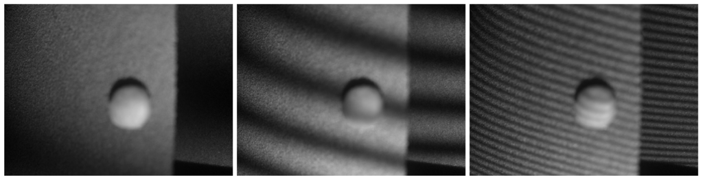 The adapted application is based on raspistillYUV from the userland library. The image data is converted to the YUF442 format and not compressed. The application then extracts only the luminance part of the image and copies it into a buffer. The buffer has been provided by the caller of the method. In practice the buffer was allocated by the python interpreter, so that the interpreter takes care of the memory management. Figure 4 contains a sequence of patterns used for a measurement. Only one phase per frequency is shown.