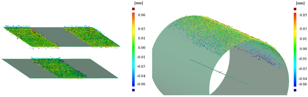 Distances of the sample measurements points to the nominal geometry of the gap (top left), the cylinder with radius 1 .