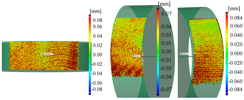 Sample measurements of the cylinder with a radius of 10 in pose 1 (left), pose 2 (middle) and pose 3 (right).