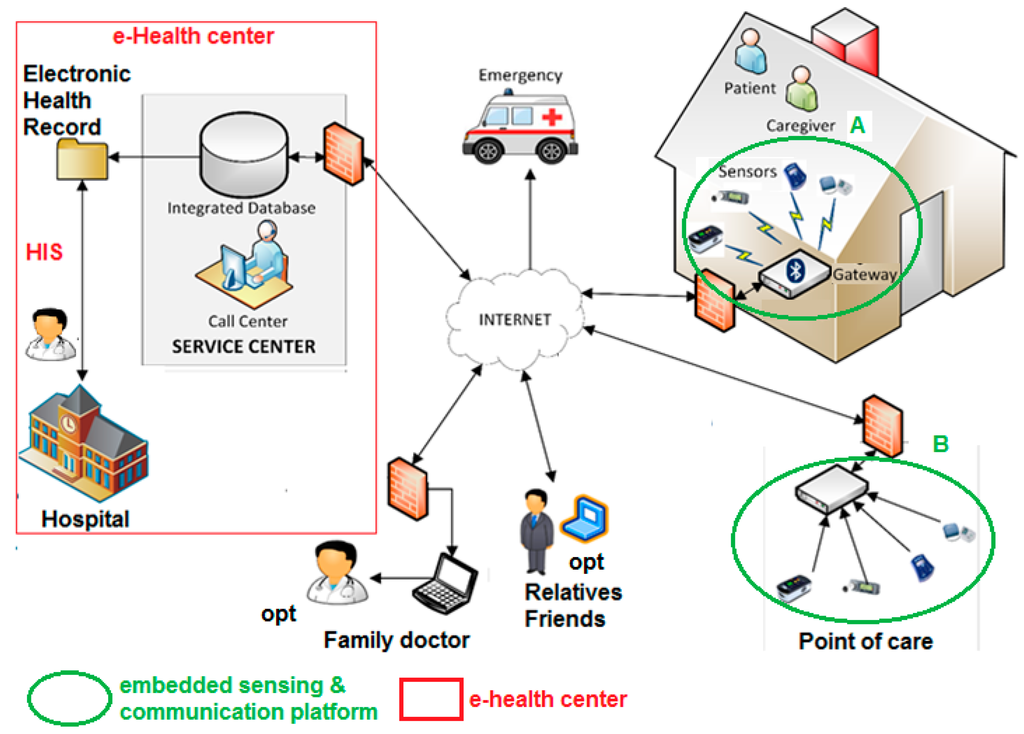 - Management platform of the electronic health record and of the home-care plan (e-Health center detailed in Section 4), integrated with the HIS, and available to specialist doctors directly or through operators of a service center. Optionally, through the service center the data of the electronic health record can also be made available to the family doctor. Alarms can be automatically generated by the embedded sensing/communication units (thanks to local signal processing capability) at home or at the point of care, or by a caregiver analyzing the data. Automatically generated alarms should be validated by a caregiver. An alarm, generated or validated by a caregiver, is communicated to emergency units for a fast re-hospitalization of the patient and, optionally, to a pre-selected list of relatives/friends.