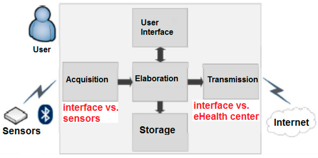 The reference architecture of the biomedical monitoring kit is reported in Figure 2. It includes: a set of wireless sensors, connected through a Bluetooth wireless technology to an embedded system (called gateway) in charge of biomedical sensor signal acquisition, local processing, and data storage, and three interfaces: one for the user, one for the sensors, and the other for the e-Health center.