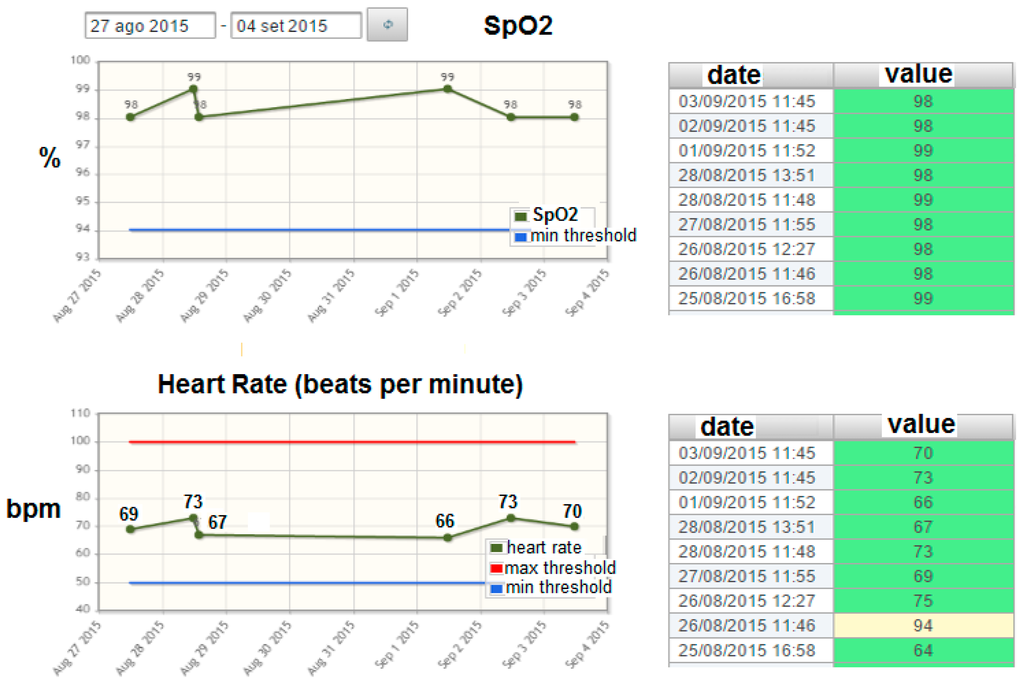 - Graphical rendering for the visualization of the historical evolution of the biomedical parameters acquired according to the specific plan (see an example in Figure 3 related to the evolution of the SpO2 parameter). The statistics and graphical rendering of the historical evolution of biomedical parameters are useful at the gateway side mainly in the “1:N” and in the “point-of-care” scenarios (where the remote acquisition of bio-signals is supervised by a professional caregiver). They are also made available at the remote server side (service center and HIS).