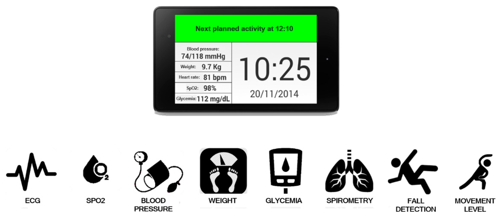The platform can be used to implement a predefined measuring protocol, i.e., a care plan assigned remotely by the family or specialist doctor. Extra-protocol measurements can be taken by the patient or the caregiver in case of necessity or can be requested remotely by the doctor. A mixture of COTS sensors and custom ones specifically designed by the research group are presented and used in this work. With respect to previous publications of the authors in [4,17,25,28], this work is extended in terms of: