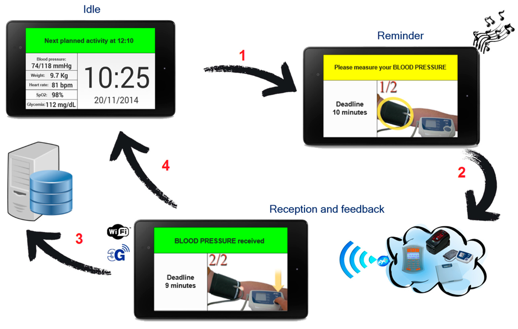 In the “1:1” healthcare model, already described in Section 2, the gateway allows the user to view the individual care plan established by the family or specialist doctor, collect the measurements from medical sensors, through a BT or BLE connection, and send them to the e-Health Center (a service center and/or the HIS) through a wired or wireless Internet connection (see Figure 4 and Figure 5). The patient also has the possibility to carry out a measurement not foreseen in the standard care plan. At a time when the activity is required, visual and audible signals inform the patient that a new measurement is required (see Figure 5). An animated image guides the patient on how to use the device to complete the task. The numbers near the arrows in Figure 5, Figure 6 and Figure 7 highlight the temporal consecution of the different steps. After the measurement, the gateway notifies the patient if the activity was successful or s/he will need to repeat the operation. The user interface has been optimized for elderly people with a simplified graphic, using a touch-screen display of at least 10 inches with large buttons. The language can be customized for the specific nation where the system is used.