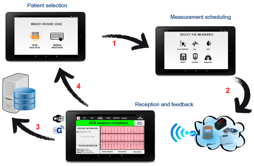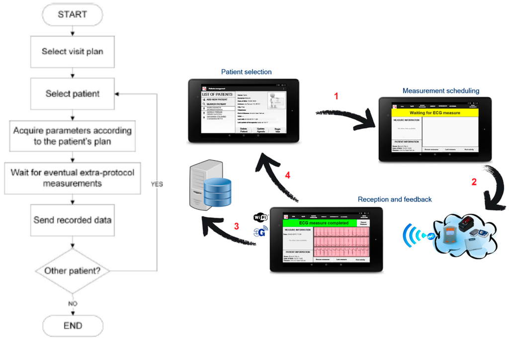 In the “1:N” scenario, instead, the professional monitoring kit allows the nurse to take measurements of vital signs during home visits to different patients. As reported in Figure 6, first the gateway allows the nurse to select the specific patient (based on his/her health card or fiscal code, for example) and view the individual care plan for each patient. The user interface then guides the operator in the execution of the measures indicated in the plan. The system also allows the collection of unplanned measures and allows the repetition of the measurements made. Since the user is a professional one, more complex visualizations such as the ECG trace are available. The gateway can also work in offline mode, by sending all the measurements acquired at the end of the home visits. The professional operator selects the patient from the list of the clients and takes the measures foreseen in the individual care plan, making sure that the quality of the measurement is satisfactory. If it is not, s/he can proceed with a repetition of the measurement. The acquired measurements are sent to the e-Health Center, through the Internet connection. Figure 6 reports the complete flow.
