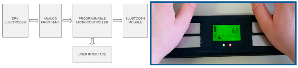 - A single-lead ECG sensing device, patent-filed technology [33], which allows for self-monitoring of the heart in an easy way without the need to connect lots of electrodes in different parts of the body, but simply placing the two hands of the patient on top of a couple of electrodes. This sensor is further discussed in Section 5.2. This sensor, although simple and easy to use, can provide a graphical trace of the ECG and automatic measurement of heart rate and its statistics, thus being useful for arrhythmia monitoring.