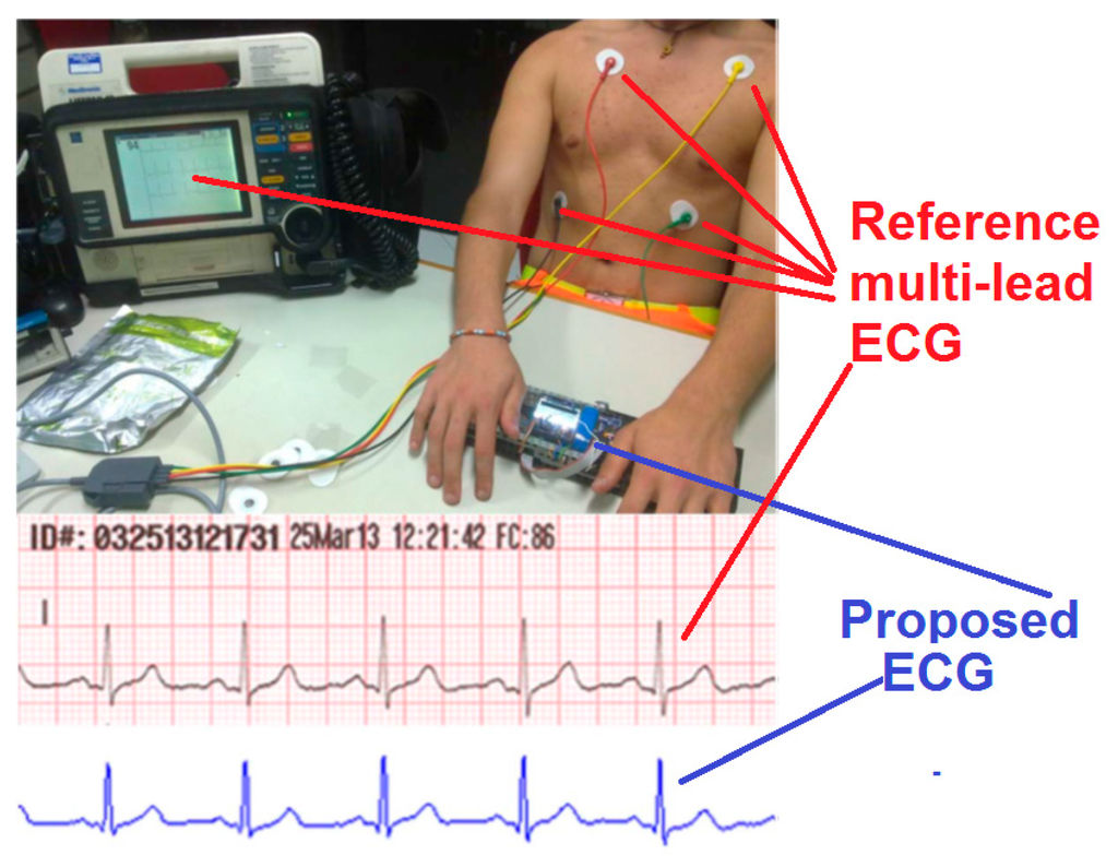 - Benini, A.; Donati, M.; Iacopetti, F.; Fanucci, L. User-friendly single-lead ECG device for home telemonitoring application. In Proceedings of the 2014 8th International Symposium on Medical Information and Communication Technology (ISMICT), Firenze, Italy, 2–4 April 2014.