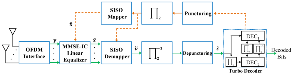 The concept of turbo equalization allows improving communication system performance by iteratively exchanging information between the soft-input soft-output (SISO) equalizer and the SISO channel decoder. It was initially introduced in [5] to alleviate the destructive effects of inter-symbol interference (ISI) for wireless digital transmission, which is protected by convolution codes. In modern communication systems, the use of MIMO raises co-antenna interference at the receiver side. Nowadays, to combat against ISI, orthogonal frequency-division multiplexing (OFDM) is mainly utilized. In a MIMO-OFDM system, where a receiver should address the effects of co-antenna interference, in addition to ISI, the concept of turbo equalization can be used to mitigate iteratively the co-antenna interference. Among different equalization methods, MIMO minimum mean-squared error (MMSE) is a prominent low-complexity suboptimal algorithm [6,7]. Using the MMSE algorithm in an iterative scheme compensates sub-optimality and leads to an error-rate performance near enough to the performance achieved when the optimal high-complexity maximum-likelihood (ML) algorithm is used [8,9].