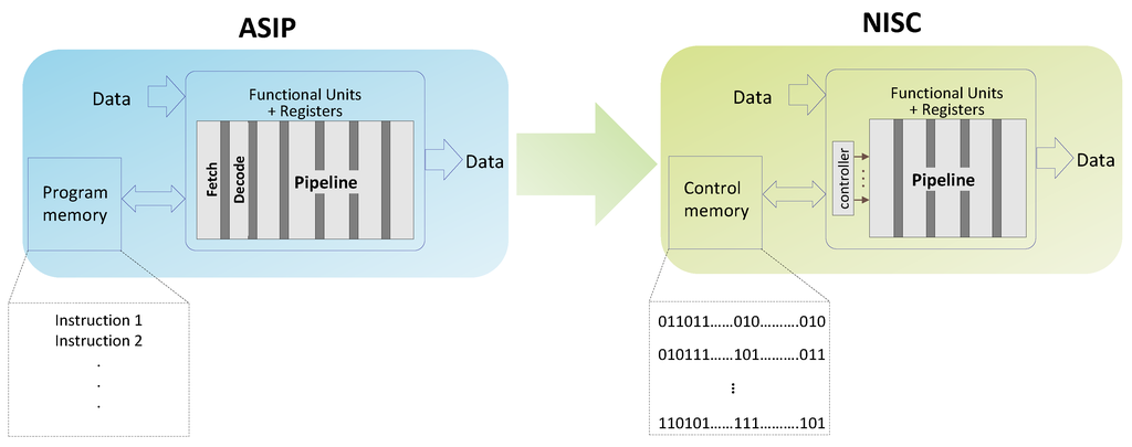 In addition to the requirements of efficiency and productivity, the emergent flexibility requirement sets up a new design metric. The application-specific instruction set processor (ASIP) concept offers a trade-off in terms of the efficiency of the application-specific integrated circuit (ASIC) and the flexibility of the general purpose (GP) processor by customizing the datapath structure and functionality by using a custom instruction set. In cases where the tailored hardware is dedicated for a particular fixed application, the process of instructions’ specification and describing forms an overhead. Instead of dynamic scheduling, no instruction set computer (NISC) concept adopts static scheduling of operations to simplify the ASIP approach. Figure 2 shows the transition from the ASIP design approach to the NISC design approach.