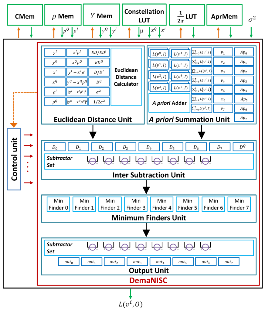 The DemaNisc module is considered the main core of the architecture design tailored to implement the Max-Log-MAP demapping algorithm. From a hierarchical scope, it can be viewed as a concatenation of five units: