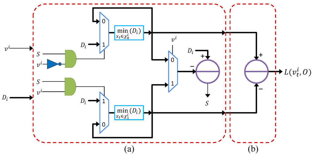 (a) Minimum finder operational unit; (b) subtractor used in the subtraction operation of the minimum pair.