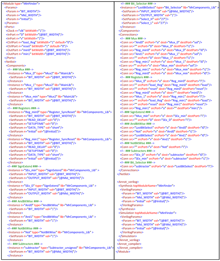 The first step towards design development is to describe the datapath of the proposed architecture. The datapath is captured in (GNR). Using HDL description (i.e., Verilog), all basic components, such as multiplexers, adders, subtractors, multipliers, registers and converters, are first defined. In GNR, basic components are simply described by indicating their types, ports, parameters and aspects. Hierarchical modules (such as computational unit, multiplexing unit, storage unit and the EquaNisc module in the equalizer architecture; and Euclidean distance unit, the a priori LLR summation unit, inter-subtraction unit, minimum finders unit, output unit and the DemaNISC module in the demapper architecture) are built in GNR. A hierarchical module can be composed of basic component(s) and/or module(s) of lower hierarchical level. Figure 8 presents the GNR description of a minimum finder block used in minimum finders unit (MFU) of the DemaNISC module (Figure 5a). The figure illustrates the construction of the “MinFinder” module from basic blocks, such as multiplexers, subtractor, registers and logic gates, in addition to its internal netlist. The module has seven ports and is parametrized by three parameters (BIT_WIDTH, Mid_WIDTH and Initial), which are used as internal specifications and are defined by higher hierarchical level components. In each architecture, all required components and modules are allocated, and their attributes and interconnections are assigned. The automatic completion of the GNR description is exploited to reduce the datapath modeling. In addition, syntax checking and rule validation, which are provided by the tool set, are used to quickly detect and fix connection errors.