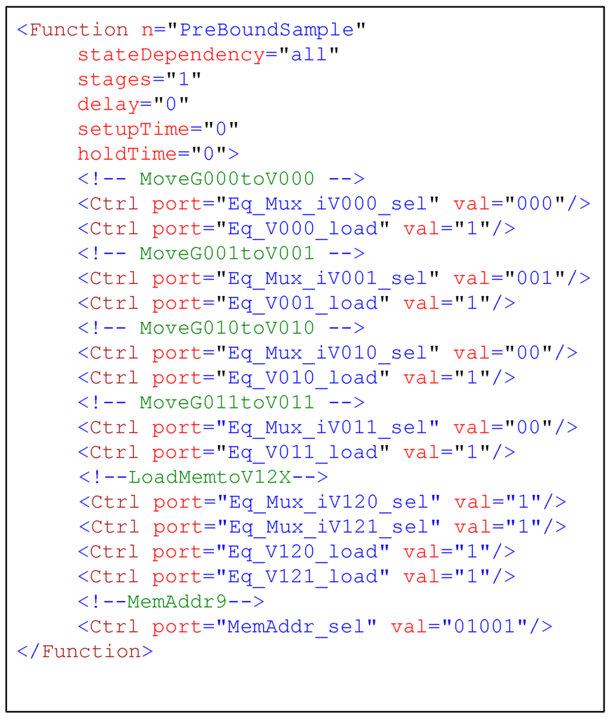 The following step after datapath description is to declare pre-bound functions defining the functionality of the EquaNISC/DemaNISC module. All control values that should be applied to control ports of hardware resources in a definite clock cycle are enumerated in a specific pre-bound function. All independent operations are merged into single pre-bound function in order to maximize the exploitation of hardware resources and to decrease the execution time. Figure 9 shows a pre-bound function sample, which merges several operations (four data transfers (move), one data loading from ChMem and setting a new address) into one pre-bound function “PreBoundSample”. As shown in the figure, in addition to scheduling information, all required control values of all incorporated resources and ports are specified explicitly. When all pre-bound functions are described, the PreboundCGenerator tool is utilized to process the structural description of all pre-bound functions and to generate their corresponding C definitions. A C code application is easily developed by listing the sequence of C definitions related to all pre-bound functions involved in MMSE equalization/Max-Log-MAP demapping. Figure 10a presents the list of C definitions that are related to pre-bound functions defining the functionality of the DemaNISC module. Figure 10b shows the GNR description of the pre-bound function “QPSK1”, which declares the control values that should be applied at the first step of demapping for the QPSK modulation scheme. The C application is verified by checking the code syntax and the availability of used C definitions of pre-bound functions. The last step in NISC abstraction level is to compile the datapath and the C code application. The tool set compiler is used to generate the control words, which are arranged automatically in the output memory file. The RTL generator in the tool set produces the HDL code, which describes the whole design architecture benefiting from the compiler information and the datapath structure.
