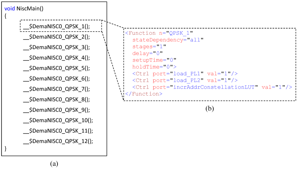 (a) List of C definitions related to pre-bound functions defining the functionality of the DemaNISC module and (b) GNR description of the pre-bound function “QPSK1”, which declares the control values that should be applied at the first step of demapping for QPSK modulation scheme.