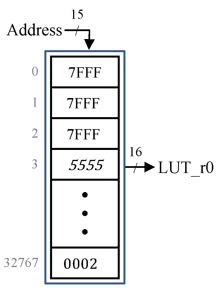 To measure the exact performance of the designed equalizer architecture, on-chip validation is performed for all system configurations. This step requires, after building the complete system prototype, setting input memories with the right content. Besides the CMem, ChMem and LUT, a new module, the so-called MapMem, is established. The MapMem module integrates memory blocks, which are required to contain mapper output information. The contents of the ChMem and MapMem memory blocks are generated automatically from the fixed-point software reference model along with a reference result file containing the output of the equalizer. Concerning the control memory CMem, the CWs produced by the compiler are utilized. Only the sequence of control signals that are related to the equalizer architecture are extracted and imported to CMem. The contents of LUT are positive 16-bit inverse values represented in the two’s complement format. A software model is developed to compute the reciprocal of all possible positive numbers. The generated values are stored such that each memory location contains the quantized inverse value of its address. Figure 12 shows the structure of LUT. The implementation of LUT requires a memory size of 64 kB. Figure 12 shows the structure of LUT. Since LUT stores positive values, then the most significant bit (MSB) in all stored values is zero. A 4-kBreduction in the size of the LUT memory block can be achieved by eliminating the MSB. When retrieving an inverse value, the output should be extended by padding a zero in the MSB.