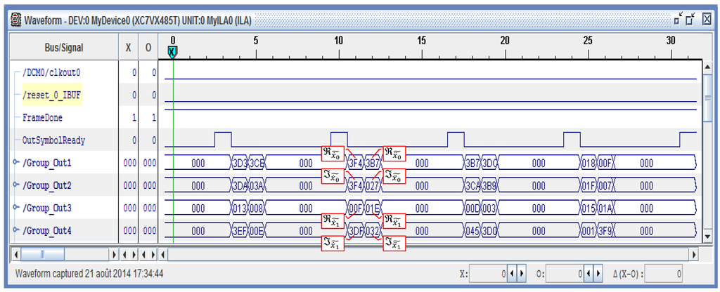 Figure 14 shows the waveform window of ChipScope Pro Analyzer software displaying the waveforms of captured data signals representing the equalizer outputs in the case of 2 × 2 block fading mode. The definitions of these signals are discussed previously for Figure 11.