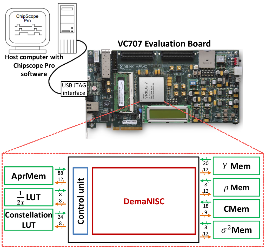 Using the same methodology adopted for equalizer architecture, the NISC-based demapper architecture has been prototyped and validated. Figure 15 shows the on-chip prototype diagram of the designed demapper. The contents of input memory blocks are generated from the fixed-point reference software module. The output results are captured using ChipScope and are compared to reference software output results.