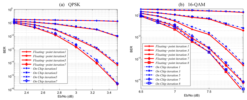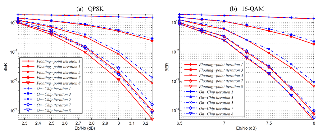 From all monitored signals, the outputs of the equalizer and demapper modules are exported and recorded. The saved results corresponding to all frame symbols are then compared with reference results. For all system configurations, the results acquired from the FPGA prototypes have been verified to match exactly the performance of the corresponding reference software model. Figure 16 and Figure 17 show, respectively, the receiver bit error rate (BER) performances obtained after on-chip evaluation of the designed equalizer and demapper. Furthermore, the figures show the equivalent reference software model of 1536 source bits, using 4 × 4 MIMO over a fast fading Rayleigh channel for different numbers of iterations with code rate and considering the QPSK and 16-QAM modulation schemes. The hardware-measured BER shows acceptable performance degradation when compared to floating-point C simulations.