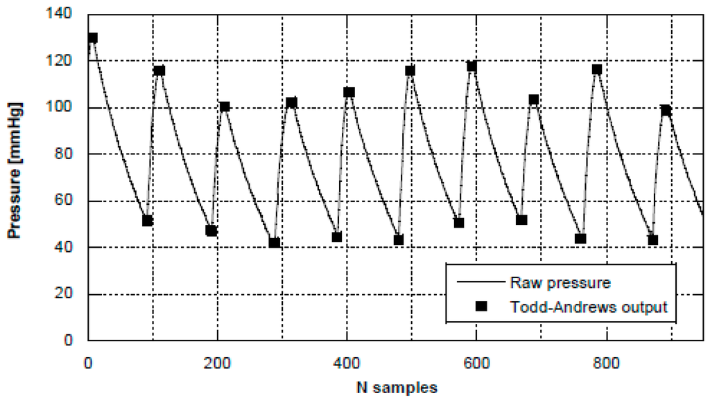 The system embedded firmware includes the algorithm for the identification of the blood pressure peaks, essential for analyzing the effects of pharmacological treatments on test animals. Peaks and troughs, corresponding to systolic and diastolic pressure respectively, characterize the blood pressure signal. Systolic phase occurs during ventricles contraction, while diastolic phase take places at the beginning of the cardiac cycle, when the ventricles are filled. The identification of peaks is a common problem in the analysis of physiological signals; often it is necessary to detect peaks in real time, but the task is frequently complicated by baseline wander and other type of interference [4]. The search for systolic and diastolic pressure of every cardiac cycle has been implemented with the Todd-Andrews algorithm. The choice of such an algorithm is due to the benefits in terms of local peaks, baseline wandering and dynamic threshold immunity. It mainly consists of three steps: First, it looks for the maximum on the rising edge of the signal by comparing each sample in the array with the previous one. Then it calculates the difference between every sample of the falling edge and the identified maximum. If the result of the subtraction is greater than a fixed threshold, the global maximum has been found. The threshold can be computed dynamically on the amplitude of the previous signal period. The same process is applied on the falling edge to find the minimum value. Figure 2 shows the algorithm validation that has been done manually varying the input signal pressure with a sphygmomanometer.