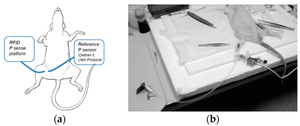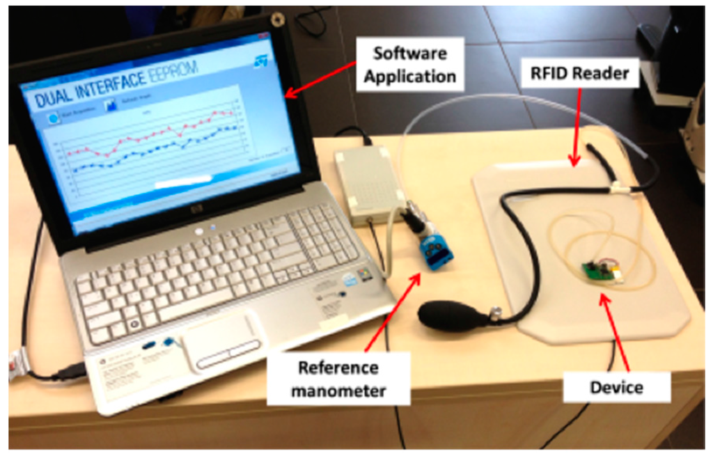 The device has been initially characterized in the laboratory and then evaluated on test rats. The system functionality tests were carried out connecting a catheter to the device pressure sensor and imposing air pressure changes with the sphygmomanometer. The pressure has been monitored with both the RFID sensor tag and a reference manometer (SICK PBS), which it has an analog 4–20 mA interface (see Figure 4). For comparison purposes the firmware was modified in order to acquire the pressure signal for 20 s and store raw data on the RFID tag memory. A software application was implemented in order to view on a PC the signal pressure, uploaded using the RFID reader. The communication distance between the interrogator and the transponder has been successfully tested up to 11 cm, which does not change interposing a hand or other material (i.e., wood, plastic, etc.) between the reader and the device [10]. In fact, thanks to RFID advantages, the tissues interposed between do not significantly attenuate the electromagnetic waves during the tag-reader communication.