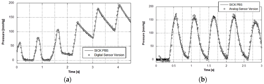 The analog pressure sensor, based on a bridge configuration, is connected to an instrumentation amplifier (INA) obtained by using three operational amplifiers, which are embedded in the microcontroller. This solution is optimal in terms of space occupancy, since only passive elements are needed to acheive full front-end amplification. The same tests done with the digital pressure sensor have been performed even with the system with the analog sensor configuration. The measured resolution of the analog pressure sensor is 5 mmHgrms and the difference between the two acquisition traces is less than ±10 mmHg (see Figure 5b).