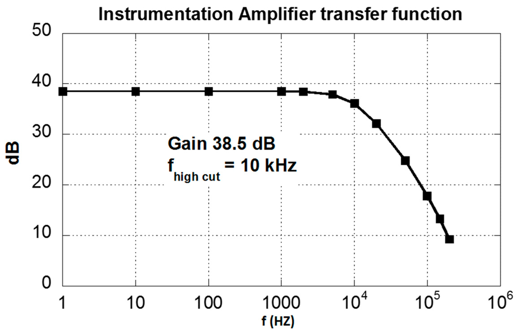 Figure 6 shows the measured transfer function of the instrumentation amplifier, featuring a gain of 38.5 dB and a bandwidth of 10 kHz. The INA output is acquired by the microcontroller ADC running at 1 kS/s.