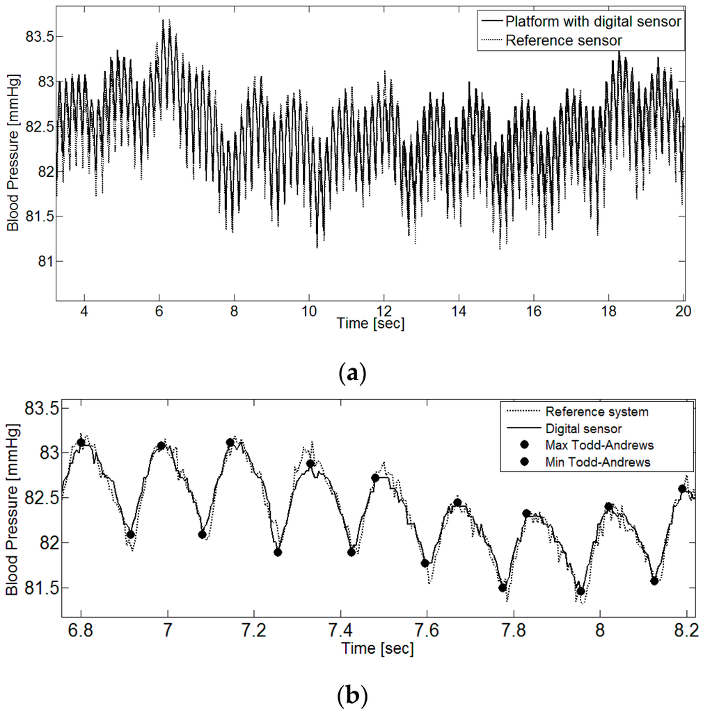 Figure 5a depicts the simultaneous acquisition of the pressure wave from the reference pressure sensor and the proposed device with digital pressure sensor mounted. The reference sensor resolution is 3 mmHgrms, whereas the device measured resolution is 2.5 mmHgrms for the digital version. The differences between the two traces are comprised between ± 5 mmHg. During the system characterization it has also been tested the maximum output data rate (833 Hz) of the I2C sensor interface, which provides a direct connection to the microcontroller.