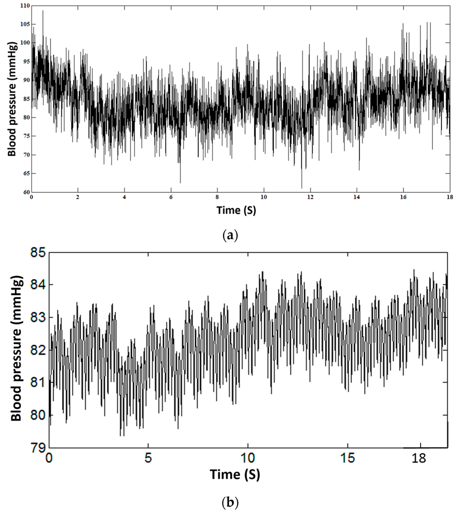 (a) Synchronous recording (~20 s) of the femoral artery blood pressure with the device mounting the analog sensor; (b) pressure wave acquired by the reference sensor.