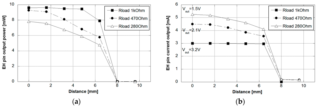 Electrically Erasable Programmable Read-Only Memory energy harvesting characterization as a function of the distance from the reader; in terms of power (a) and current (b); power can be extracted up to 6.5 mm distance.