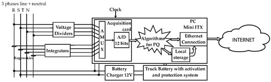 The acquisition card mounted inside the personal computer (PC) was a Measurement Computing Data Acquisition System (DAS) 8/12 [,] with eight input channels—four connected to the current sensors and four connected to the voltage ones. The current sensors were four Rogowskies (Rocoil Ltd., Harrogate, UK) [] with an accuracy of ±1%, whose pass band was typically at least three orders of magnitude wider than a current clamp. This allowed for the avoidance of the typical distortion introduced by ferromagnetic core devices. The output signal is proportional to the derivative of the current; therefore, an integration stage placed before the acquisition card was necessary. The sensors for the voltage were dividers built up with resistors, which have an accuracy of 0.1% mounted on a custom card. The dividers were necessary to reduce the high voltages of the mains to the values accepted by the input dynamic range of the acquisition card.