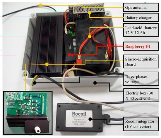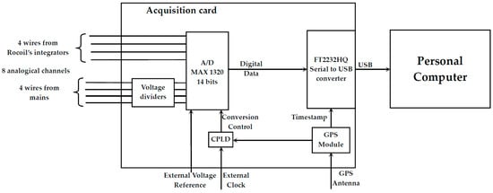 - Then, we developed a custom acquisition board that improved the overall performance of the instrumentation [,,,,]. In order to preserve all the information of the phases between the voltages and the currents, the new acquisition card was capable of simultaneously acquiring eight channels without multiplexing.