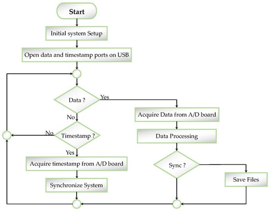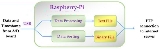 As is possible to see, in this new architecture, the Raspberry has the fundamental role of control of the acquisition, of data storage, and of data transmission to the Internet server. All the activities previously performed by the PC are now fully satisfied by the Raspberry, including data elaboration. The functional diagram of the algorithms that run on the Raspberry is represented in Figure 5.