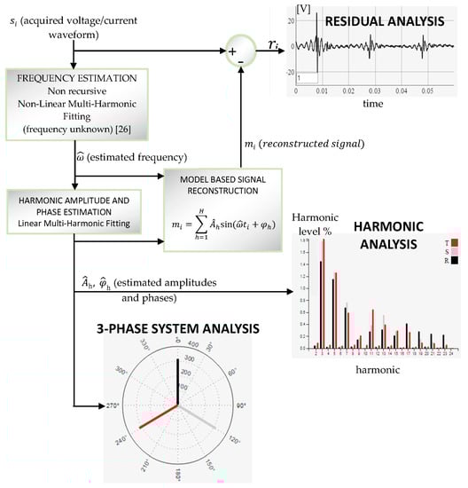 The most important step in the last flow chart is the data processing. Figure 7 shows a schematic representation of the signal processing implemented. Once the signal samples si is acquired, the fundamental frequency is estimated. The algorithm used for the estimation of the frequency is the multi-harmonic least squares fitting [,,]. Compared with the more widely used methods such as FFT and zero crossing [,,,], these methods do not require a coherent sampling and produce good estimations also acquiring few cycle of the fundamental [,,,]. To reduce the computational burden of the algorithm, a non-recursive approach presented in [] was used.