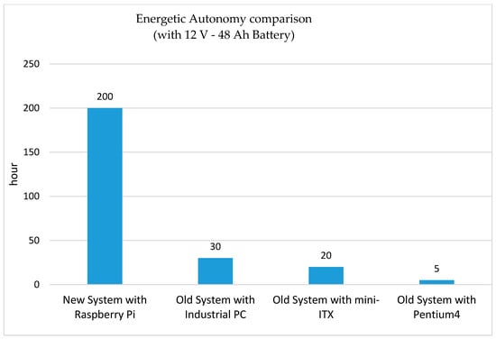 The whole system had an energetic autonomy of 36 hours in case of blackout. The last probe satisfied this requirement with a battery of 12 V and 12 Ah (experimental tests showed activity up to 48 h). Using the same battery, Figure 10 shows the autonomy between the last version of the probe and the previous versions.