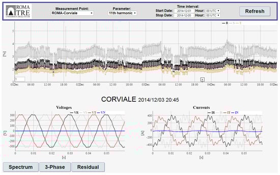 Figure 13 shows a screenshot of the data: on the top, it is possible to see the time trend of one of the measured parameters, while the recorded waveforms, in a given timestamp, are shown in the bottom of the figure. For the site called “Corviale” (probe RM3), located in Rome, the figure shows the time evolution of the 11th harmonic on the top, while the trend of the voltages and current waveforms are viewable on the bottom of the figure.