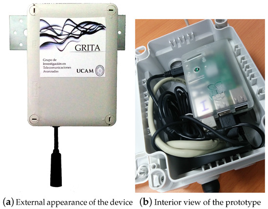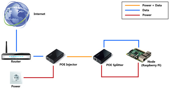 In this way, a POE injector [28] has been placed in the network input, and a POE splitter in the output of the circuit, inside the box where the components are placed [29]. With the use of a category 5, 5e or 6 cable, a maximum distance of 100 m from the injector to the splitter can be used. In this work, the maximum length used is less than 10 m and the category of the cable is 5e. The splitter is in charge of the division between the current supply, for powering the device, and the data channel, for providing the Raspberry Pi with Internet connection, as seen in Figure 1. The output voltage is adjustable in the splitter model used, and it is adjusted to 5 volts, in order to correctly supply the Raspberry Pi and its components. In this way, there is no need for using an additional voltage transformer in the device.