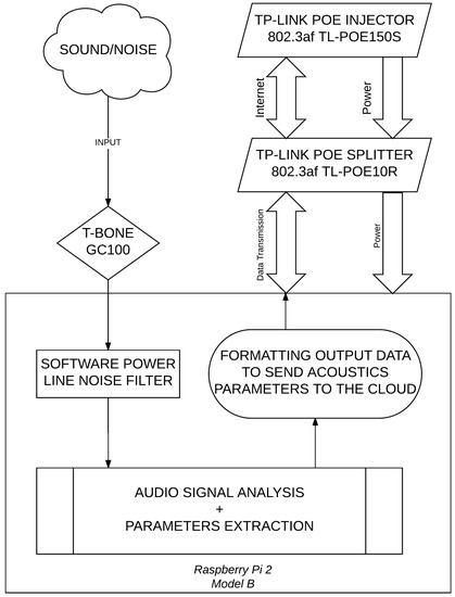 In Figure 2, a complete block diagram of the whole acoustic device is presented, where all the functioning blocks of the system are shown. One of the inputs of the system is the acquisition of the sound by the microphone capturing the ambient sound and converting the analogue sound signal to a digital form with the sound card integrated in the microphone. Then it goes to the Raspberry Pi processing stage for the parameters extraction. Next, the data are formatted to send the acoustic parameters to the cloud.