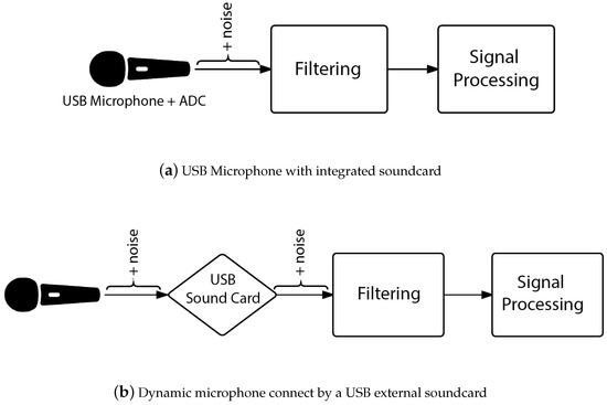 Different sound acquisition settings. (a) An electrec USB microphone without an external sound card; (b) Low-cost USB sound card with a dynamic microphone.