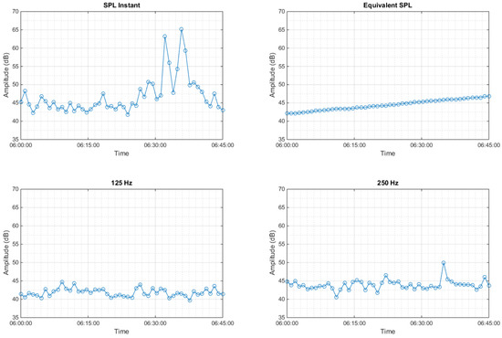 Views of the instant sound pressure level broadband and for 125 Hz and 250 Hz third octave bands and for the equivalent sound pressure level.